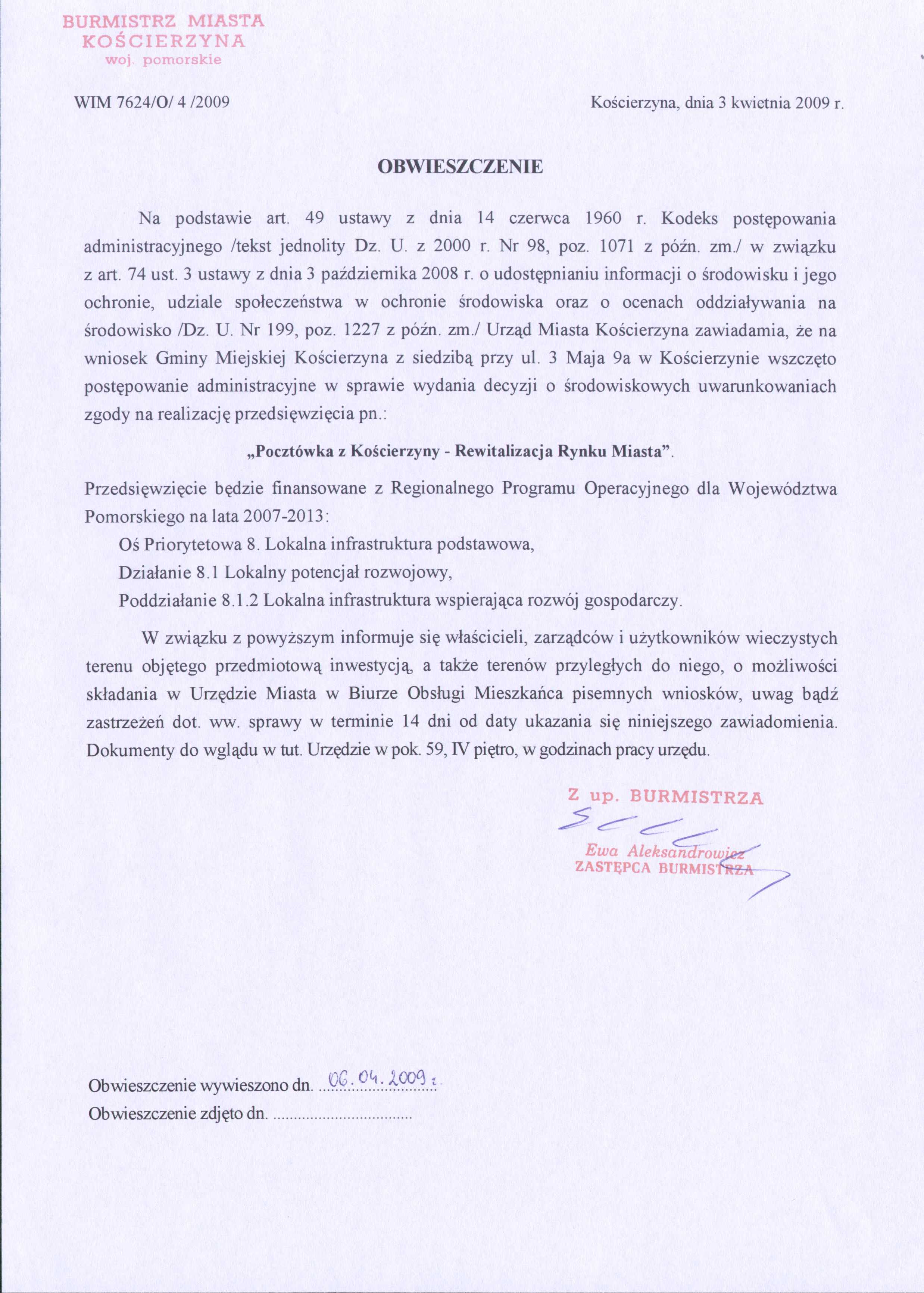 Postanowienie – PPIS w Kościerzynie – uzgodnienie (zamieszczono 19.01.2009)